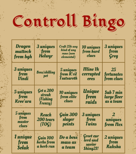 This clan bingo was organised by Snus, who created and orchestrated the event. Thank you Snus! Keep scrolling for the final results.